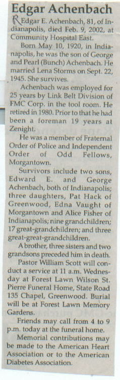 Survived By Widow; 2 sons, Edward E. and George Achenbach; 3 daughters, Pat Hack, Edna Vaught, and Alice Fisher; 9 grandchildren; 17 great-grandchildren; 3 great-great-grandchildren.