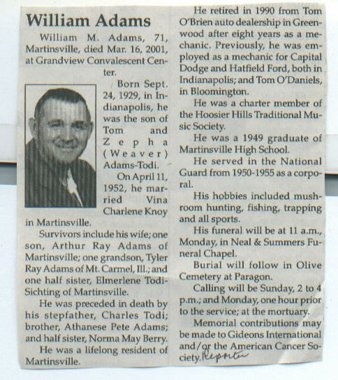 Survived By Wife; son, Arthur Ray Adams; grandson, Tyler Ray Adams; half-sister, Elmerlene Todi-Sichting.