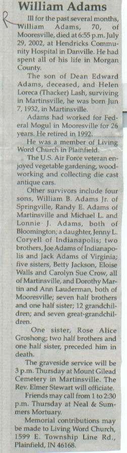 | Survived By | Mother, Helen Loreca (Thacker) Lash; 4 sons, William B. Adams,Jr., Randy E. Adams, Michael L. Adams, and Lonnie J. Adams; daughter, Janny L. Coryell; 2 brothers, Joe and Jack Adams; 5 sisters, Betty Jackson, Eloise Walls, Carolyn Sue Crow, Dorothy Martin, and Ann Lauderman; 7 half brothers; one half sister; 12 grandchildren; 7 great-grandchildren. |