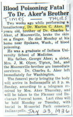 | Other | Age 30. While performing a tonsilectomy, Dr. Aker broke the skin on a finger. He died Monday at his home near Spokane, Wash., of blood poisoning. |