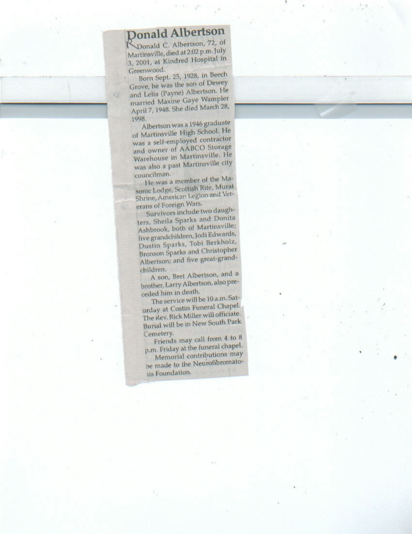 | Other | Age 72. Preceded in death by spouse; parents, Dewey and Lelia (Payne) Albertson; son, Bret Albertson; and brother, Larry Albertson. |