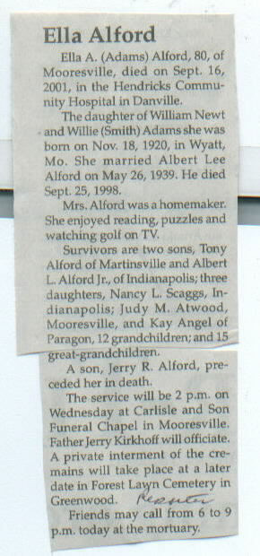 | Survived By | Sons, Tony and Albert L. Alford, Jr.; daughters, Nancy L. Scaggs, Judy M. Atwood, and Kay Angel; 12 grandchildren; 15 great-grandchildren. |