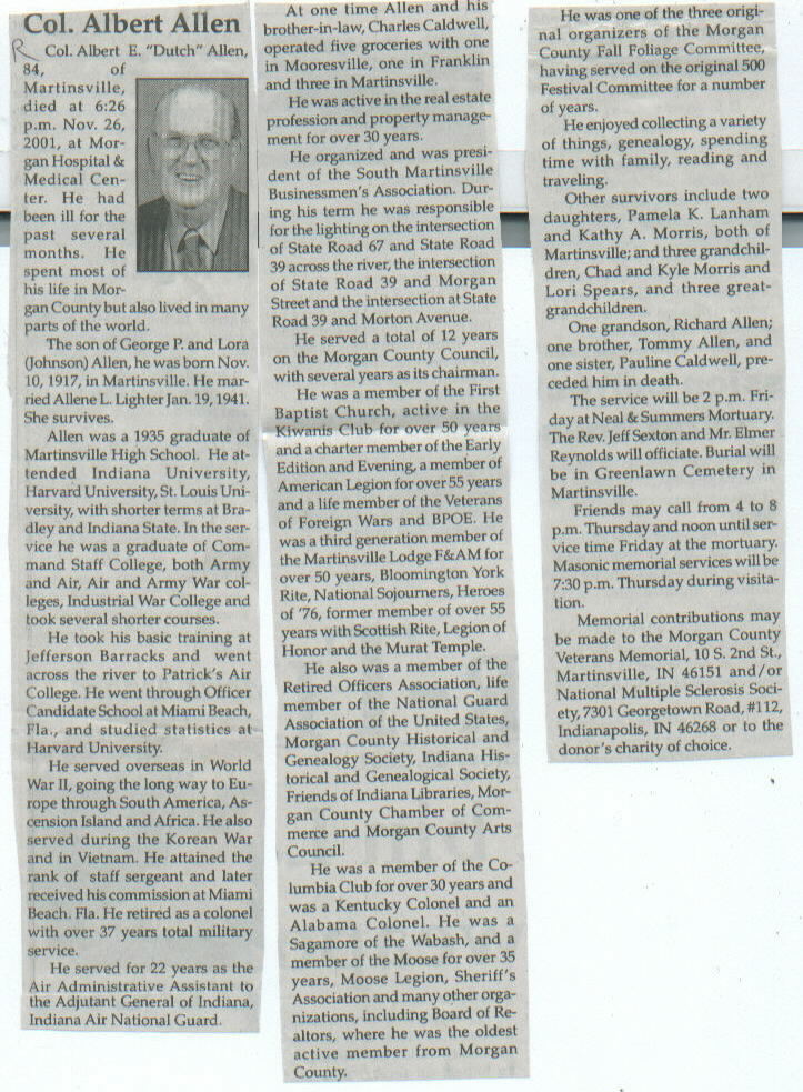 | Other | Age 84. Born in Martinsville, Indiana, to George P. and Lora (Johnson) Allen. Served in World War II, Korean War, and Vietnam. Retired as Colonel with over 37 years total military service. |