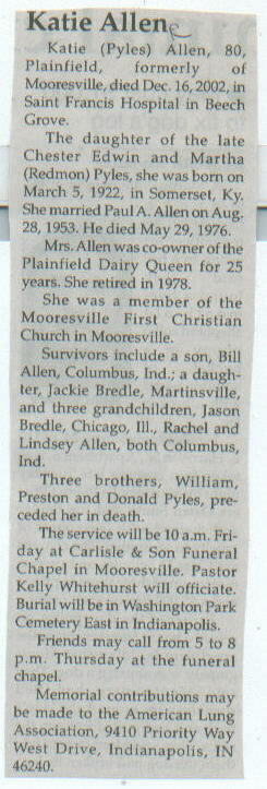 Survived By Son, Bill Allen; daughter, Jackie Bredle; 3 grandchildren, Jason Bredle, Rachel and Lindsey Allen.