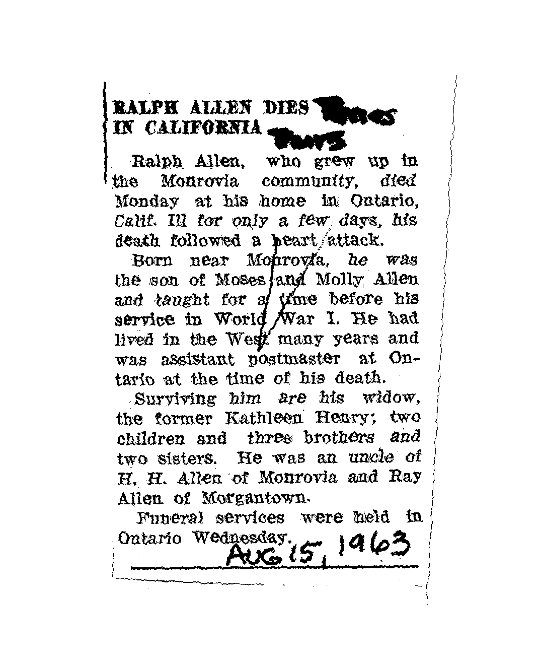 | Other | Funeral in Ontario, Calif. Parents: Moses and Molly Allen. He was an uncle of Ray Allen of Morgantown and H. H. Allen of Monrovia. Veteran of WW I. |