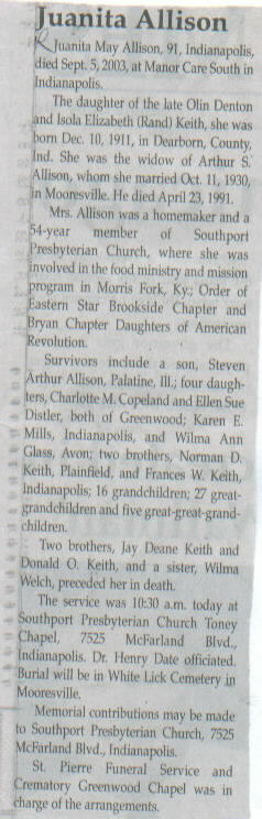 | Other | Age 91. The daughter of the late Olin Denton and Isola Elizabeth (Rand) Keith, she was born in Dearborn County, Ind. Two brothers, Jay Deane Keith and Donald O. Keith, and a sister, Wilma Welch, preceded her in death. |