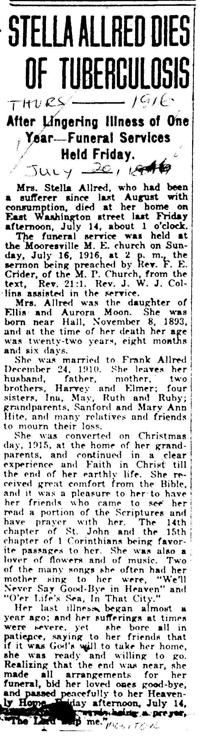 | Other | Buried Mooresville Cemetery. Rev. F. E. Crider of Methodist Protestant Church officiating. Resided on Washington St., Mooresville. Died of consumption; born near Hall. |