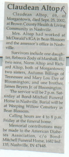 | Survived By | Daughter, Rebecca Zody; 2 sons, Norm and Richard Altop; 2 sisters, Autumn Billings and Mary Lou Day; brother, James Beyers, Jr. |