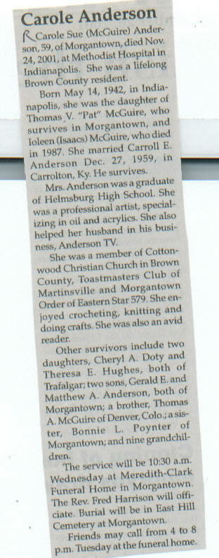 | Survived By | Spouse; father, Thomas V. McGuire; daughters, Cheryl A. Doty and Theresa E. Hughes; sons, Gerald E. and Matthew A. Anderson; brother, Thomas A. McGuire; sister, Bonnie L. Poynter; 9 grandchildren. Preceeded in death by mother, Ioleen (Isaacs) McGuire. |