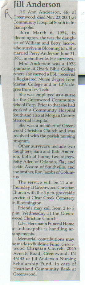 | Survived By | Parents, William and Betty Jacobs; husband, Perry Anderson; brother, Ron Jacobs; sisters, Betty Allen and Jackie Axsom; daughters, Sara Anderson and Kate Anderson. |
