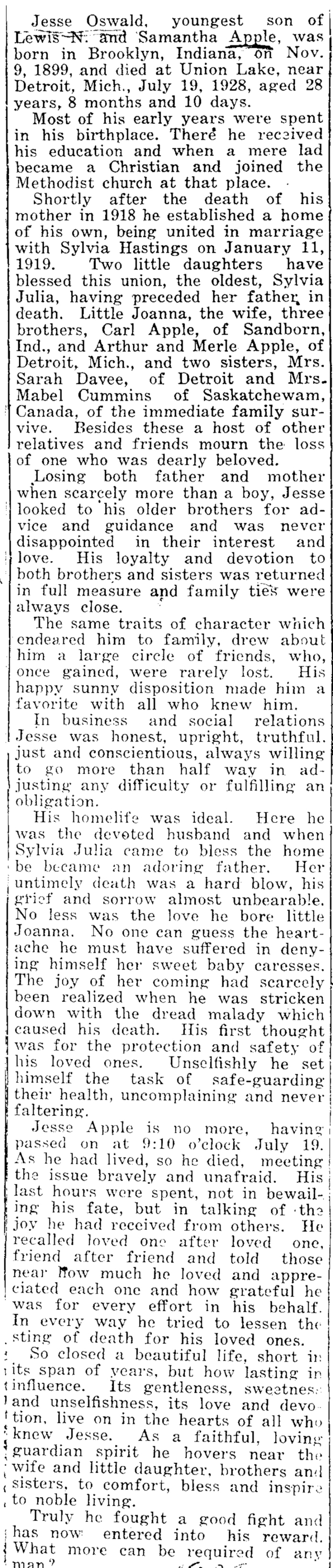 | Other | Age 28 years, 8 months, and 10 days. Youngest son of Lewis N. and Samantha Apple. Died at Union Lake, Michigan. |