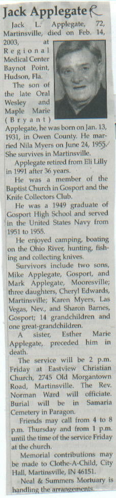 | Survived By | Widow; 2 sons, Mike and Mark Applegate; 3 daughters, Cheryl Edwards, Karen Myers, and Sharon Barnes; 14 grandchildren; one great-grandchild. |