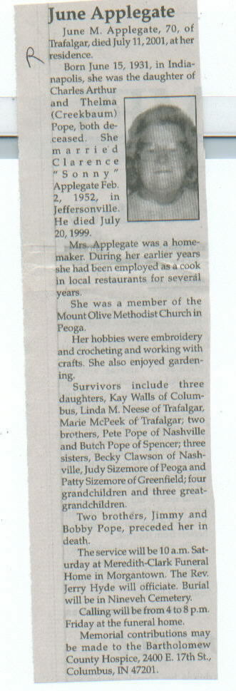 Survived By Daughters, Kay Walls, Linda M. Neese, and Marie McPeek; brothers, Pete and Butch Pope; sisters, Becky Clawson, Judy Sizemore, and Patty Sizemore; 4 grandchildren; 3 great-grandchildren.