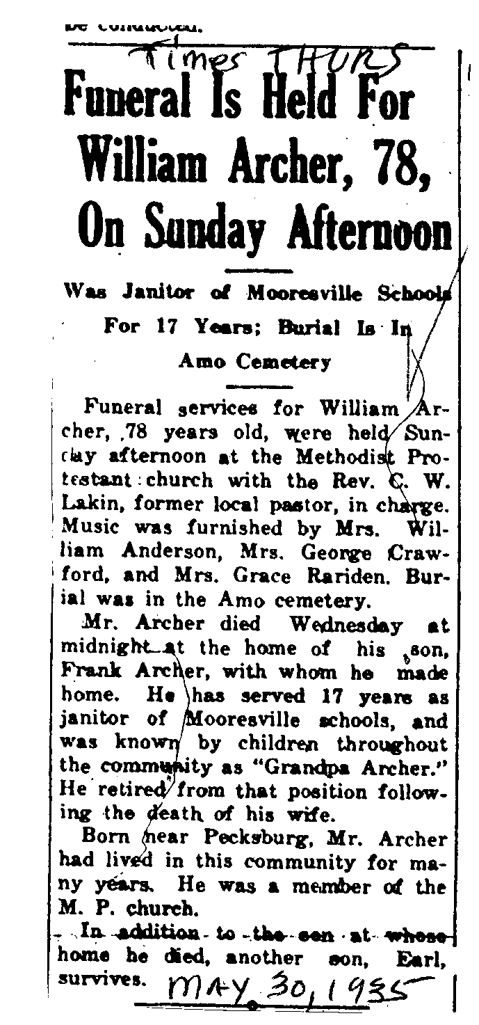 | Obituary Source | Mooresville Times, May 30, 1935 |