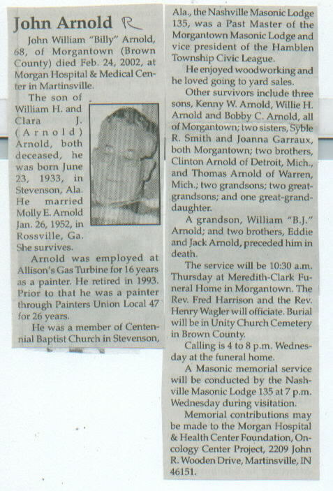| Survived By | Widow; 3 sons, Kenny W., Willie H., and Bobby C. Arnold; 2 sisters, Syble R. Smith and Joanna Garraux; 2 brothers, Clinton and Thomas Arnold; 2 grandsons; 2 great-grandsons; one great-granddaughter. |