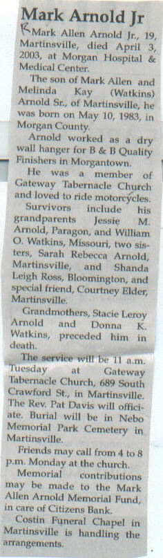 Survived By Parents, Mark Allen and Melinda Kay (Watkins) Arnold, Sr.; grandparents, Jessie M. Arnold and William O. Watkins; 2 sisters, Sarah Rebecca Arnold and Shanda Leigh Ross; special friend, Courtney Elder.