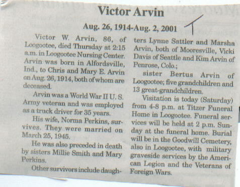 | Other | Preceded in death by parents, Chris and Mary E. Arvin, and sisters, Milie Smith and Mary Perkins. World War II US Army veteran. |