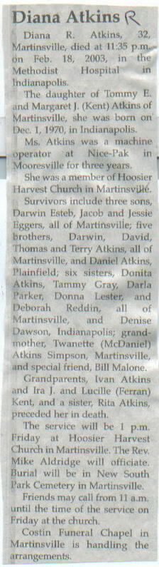 | Survived By | Three sons, Darwin Esteb, Jacob and Jessie Eggers; 5 brothers, Darwin, David, Thomas, Terry, and Daniel Atkins; 6 sisters, Donita Atkins, Tammy Gray, Darla Parker, Donna Lester, Deborah Reddin, and Denise Dawson; grandmother, Twanette (McDaniel) Atkins Simpson; special friend, Bill Malone. |