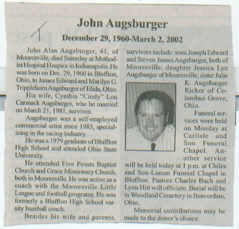 | Survived By | Widow; parents, James Edward and Marilyn G. Tripplehorn Augsburger; sons, Joseph Edward and Steven James Augsburger; daughter, Jessica Lyn Augsburger; sister, Julie K. Augsburger Ricker. |