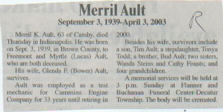 | Survived By | Widow; son, Tim Ault; stepdaughter, Tonya Todd; brother, Bud Ault; 2 sisters, Wanda Steins and Cathy Fousts; 4 grandchildren. |