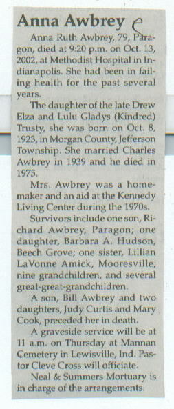 | Survived By | Son, Richard Awbrey; daughter, Barbara A. Hudson; sister, Lillian LaVonne Amick; 9 grandchildren; several great-grandchildren. |