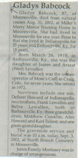 | Survived By | One son, Delbert Howard; 2 brothers, Frank Lewallen and Belve Lewallen; 3 grandchildren, Matthew Conklin, Alex Howard, and Kari Tallent; 1 great-granddaughter. |