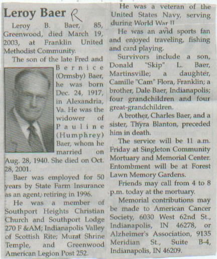 Survived By Son, Donald "Skip" L. Baer; daughter, Camille "Cam" Flora; brother, Dale Baer; 4 grandchildren; 4 great-grandchildren.