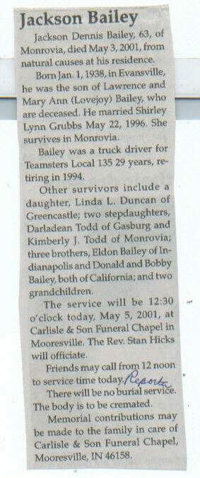 | Other | Age 63. Preceded in death by parents, Lawrence and Mary Ann (Lovejoy) Bailey. |