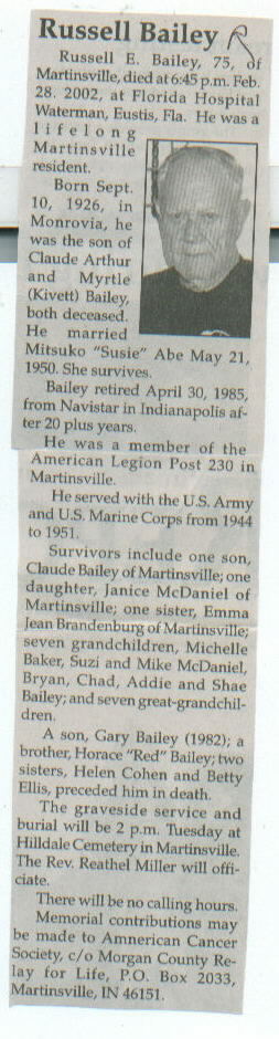 | Other | Member of the American Legion Post 230 in Martinsville. Served with the U.S. Army and U.S. Marine Corps from 1944 to 1951. |
