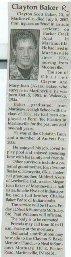 Survived By Parents, Charles Clayton and Mary Joan (Akers) Baker; paternal grandmother, Joan Yvonne Beeler; maternal grandmother, Mildred Akers; sister, Megan Joan Baker; half sister, Emelie Hyde; half brother, Charles Baker Pedro.