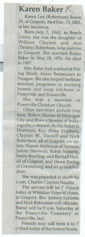 Survived By Parents, William Clayton and Avo (Tinsley) Robertson; sons, Robert and Shawn Strader; stepson, Rufus Baker, Jr.; brothers, Clayton W., Darrell, and Nick Robertson; sisters, Sharon Anderson, JoAnn Stierwalt, Robin Sublette, Emily Bowling, Rochall Hall, and Dawn Ewing.