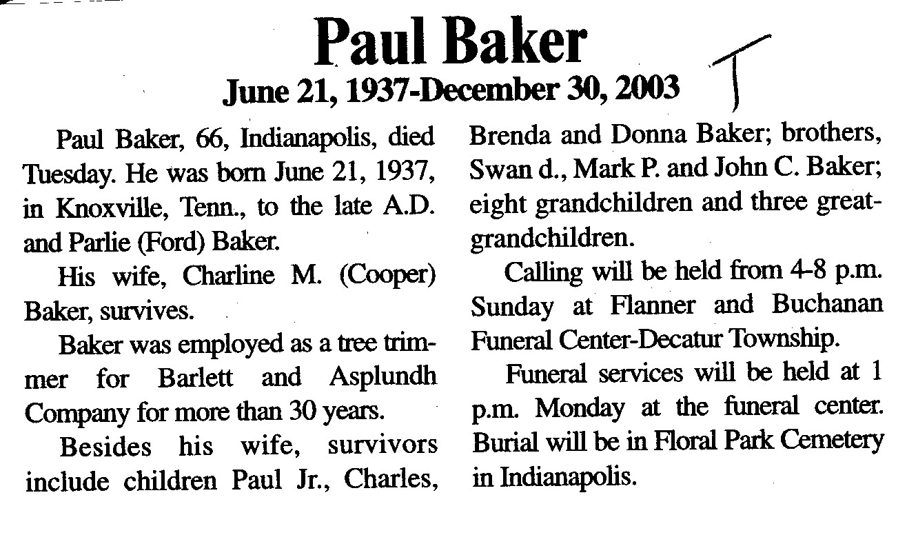 | Survived By | Wife; children, Paul, Jr., Charles, Brenda, and Donna Baker; brothers, Swan D., Mark P., and John C. Baker; 8 grandchildren; 3 great-grandchildren. |