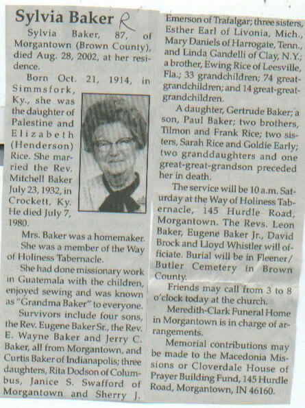 Survived By Four sons, Rev. Eugene Baker, Sr., Rev. E. Wayne Baker, Jerry C. Baker, and Curtis Baker; 3 daughters, Rita Dodson, Janice S. Swafford, and Sherry Emerson; 3 sisters, Esther Earl, Mary Daniels, and Linda Gandelli; brother, Ewing Rice.