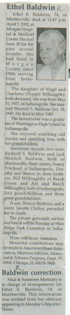 | Survived By | Two sons, Richard S. and Jack Wendell Baldwin; 3 sisters, Nancy Pritchard, Dorothy, and Sharon Jo; 3 brothers, Bill, Art, and Butch Willoughby; 4 grandchildren; 3 great-grandchildren. |