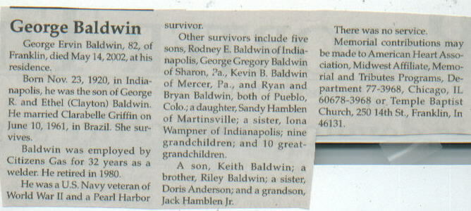| Survived By | Widow; 5 sons, Rodney E., George Gregory, Kevin B., Ryan, and Bryan Baldwin; daughter, Sandy Hamblen; sister, Iona Wampner; 9 grandchildren; 10 great-grandchildren. |