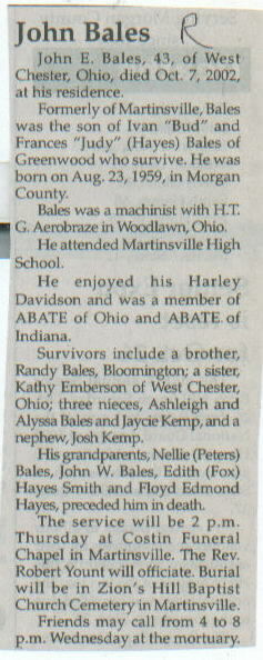Survived By Parents, Ivan "Bud" and Frances "Judy" (Hayes) Bales; brother, Randy Bales; sister, Kathy Emberson; 3 nieces, Ashleigh and Alyssa Bales, and Jaycie Kemp; nephew, John Kemp.