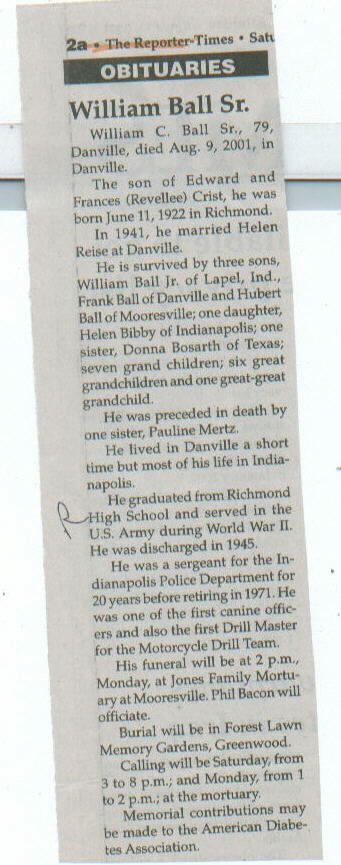 | Survived By | Sons, William Ball, Jr., Frank, and Hubert Ball; daughter, Helen Bibby; sister, Donna Bosarth; 7 grandchildren; 6 great-grandchildren; 1 great-great-grandchild. |