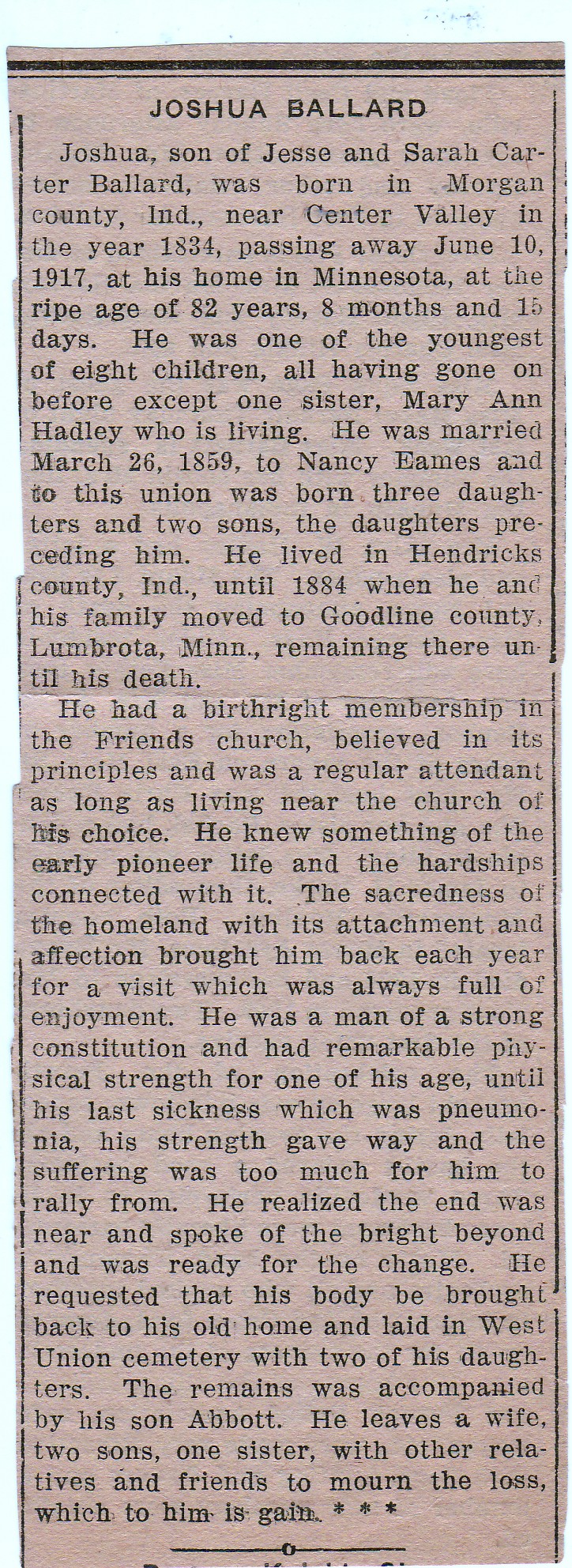 Other Age 82 years, 8 months, and 15 days. Birthright member Friends Church. Lived in Hendricks Co., Ind. until 1884, when family moved to Goodline Co., Lumbrota, Minn. Parents were Jesse and Sarah Carter Ballard. Born in Morgan Co. Civil War veteran.