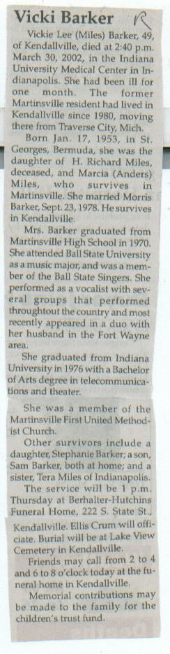| Survived By | Spouse; mother, Marcia (Anders) Miles; daughter, Stephanie Barker; son, Sam Barker; sister, Tera Miles. |