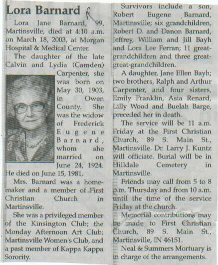 | Survived By | Son, Robert Eugene Barnard; 6 grandchildren, Robert D. and Danon Barnard, Jeffrey, William, and Jill Bayh, and Lora Lee Ferran; 11 great-grandchildren; 3 great-great-grandchildren. |