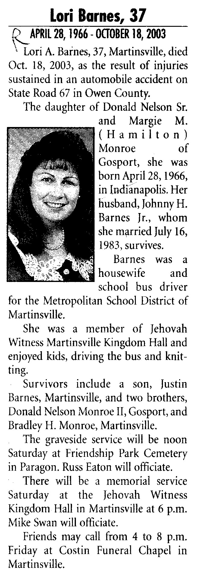| Survived By | Husband; son, Justin Barnes; 2 brothers, Donald Nelson Monroe II and Bradley H. Monroe. |