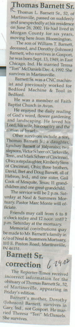 Survived By Widow; son, Thomas Barnett, Jr.; daughter, Lyndsay Barnett; 2 stepsons, Victor and Mark Scheer; stepdaughter, Kimberly Sims; 3 brothers, David, Bret, and Doug Barnett; sister, Gail Cook; 11 grandchildren; great-grandchild; mother.