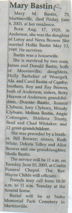 | Survived By | Spouse; 2 sons, James and Donald Bastin; daughters, Holly Bashelier and Carol Bastin; brothers, Roy and Ray Brower; sister, Betty Haynes; grandchildren, Donnie Bastin, Ronnie Clyburn, Joey Clyburn, Woody Clyburn, Melissa Bastin, Angie Cottongim, Sheilena Trusty, and Brad and Chad Whitaker; 12 great-grandchildren. |