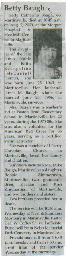 | Survived By | Spouse; son, Mike Baugh; daughter, Bobbie Zimmerman; 2 grandchildren, Keenan and Kaci Zimmerman; 2 brothers and sisters. |