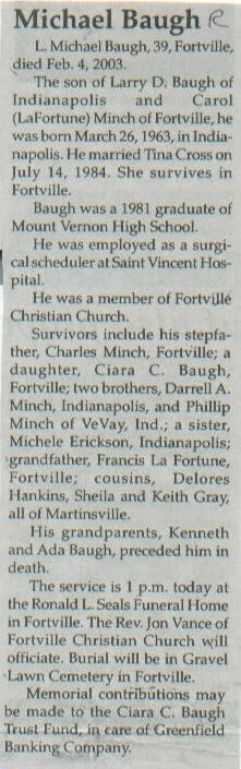 Survived By Widow; stepfather, Charles Minch; daughter, Ciara C. Baugh; 2 brothers, Darrell A. and Phillip Minch; sister, Michele Erickson; grandfather, Francis La Fortune; cousins, Delores Hankins, and Sheila and Keith Gray.