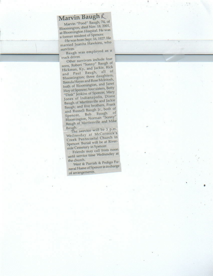 | Survived By | Spouse; sons, Robert, Jackie, Rick, and Paul Baugh; daughters, Brenda Hayes, Rose McIntosh, and Janet Hoy; sisters, Betty Jenkins, Mary Jones, Diane Baugh, and Jackie Baugh; brothers, Frank, Russell Baugh, Jr., Bob, Norman, and Mike Baugh. |