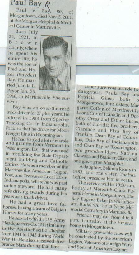 Other Preceded in death by parents, Fred and Hazel (Snyder) Bay; daughter, Belinda Ready; sister, Thelma Leffler. U.S. Army veteran in World War II; received 5 Bronze Stars.