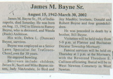 | Survived By | Widow; mother, Wanda (Rude) Anderson; children, James, Jr., Scott, and Mike Bayne; sisters, Judy VanArsdale, Jo Bird, and Joy Maubly; brothers, Donald and Robert Bayne; 4 grandchildren. |
