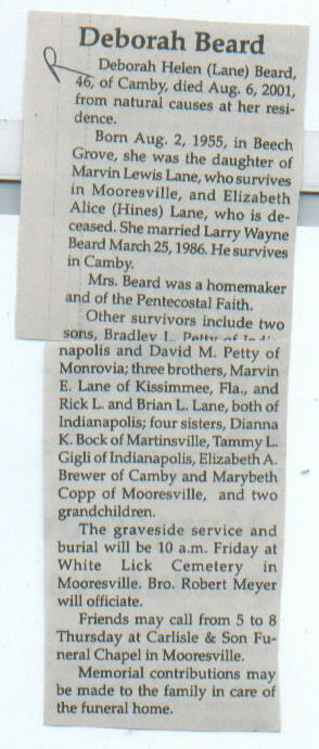 Survived By Spouse; father, Marvin Lewis Lane; sons, Bradley L. and David M. Petty; brothers, Marvin E., Rick L., and Brian L. Lane; sisters, Dianna K. Bock, Tammy L. Gigle, Elizabeth A. Brewer, and Marybeth Copp; 2 grandchildren.