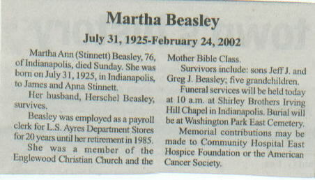 Survived By Spouse; sons, Jeff J. and Greg J. Beasley; 5 grandchildren.